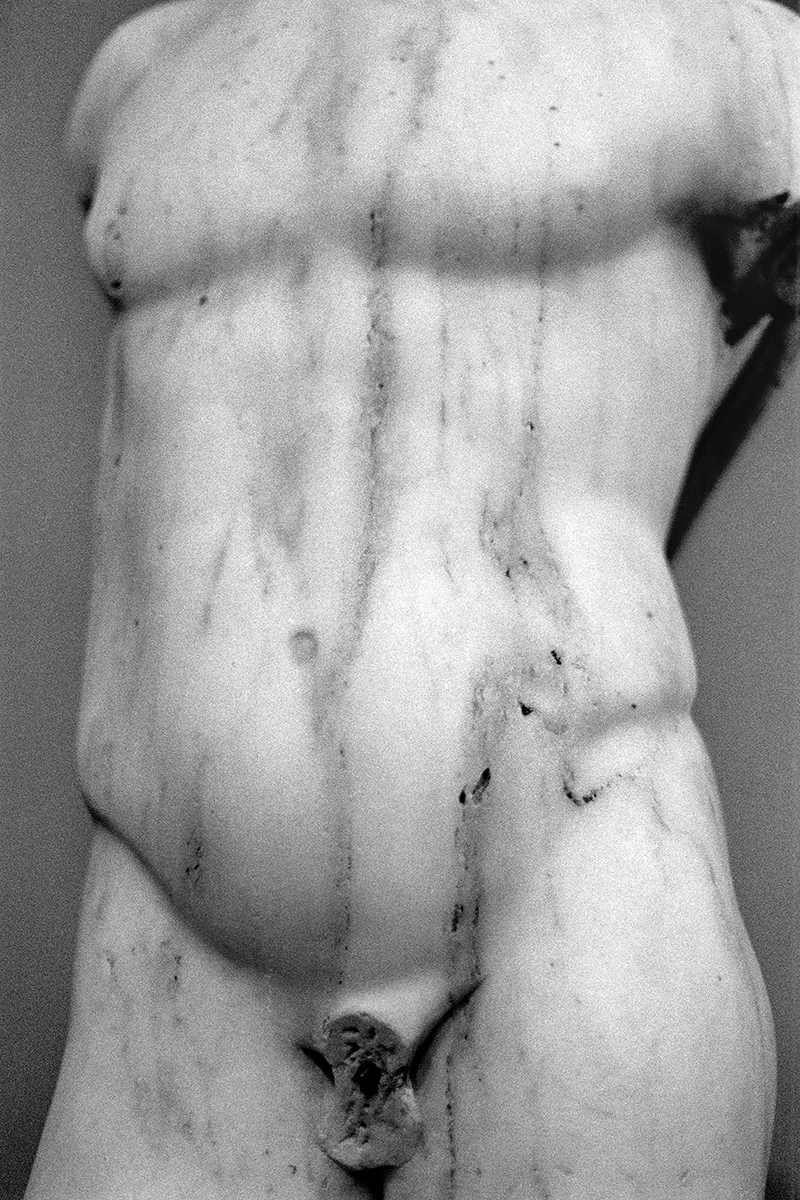 EXERESIS: Del griego, escisión. bajo el concepto de un corte radical y traumático, la fotógrafa Paz Errázuriz agrupa estas imágenes escultóricas recolectadas azarosamente en distintos museos del mundo. Algo así como esculturas encontradas, estos torsos clásicos se caracterizan por la ausencia del pene. Es esta omisión significativa lo que dramatiza el sentido y dispara la especulación: ¿Acaso el miembro fue amputado? ¿Y, si es así, bajo qué política quirúrgica? o, más patético aún, ¿el miembro viril se desprendió como un apéndice frágil y prescindible que nunca estuvo lo suficientemente adherido al cuerpo que lo sostenía? Lo que despierta la curiosidad visual de Paz Errázuriz es el carácter objetivo y científico --desprovisto de cualquier truco estético y de cualquier grandilocuencia retórica-- con que la cámara constata la ruina del símbolo fálico y la fragilidad del discurso de poder que lo sostiene.